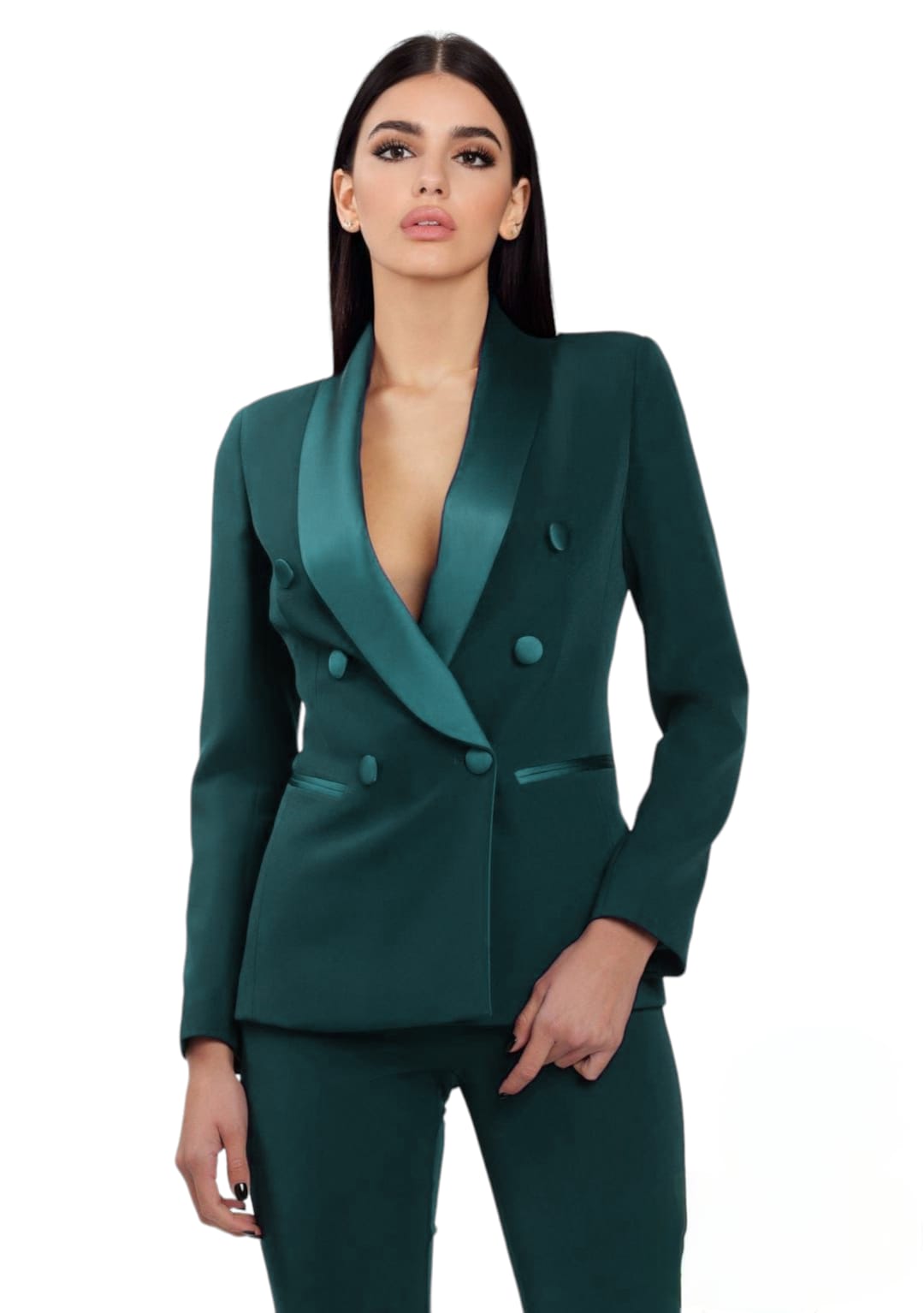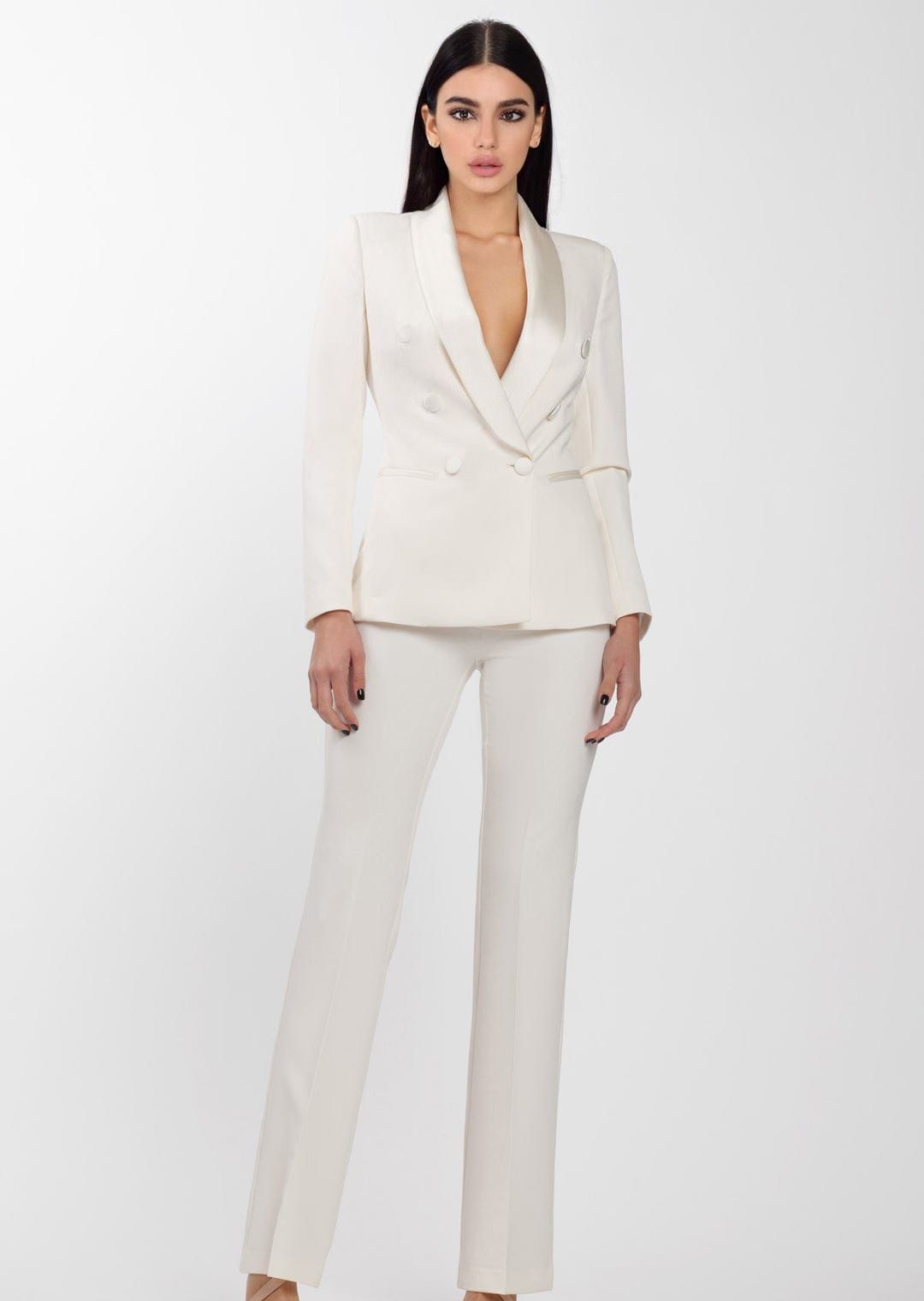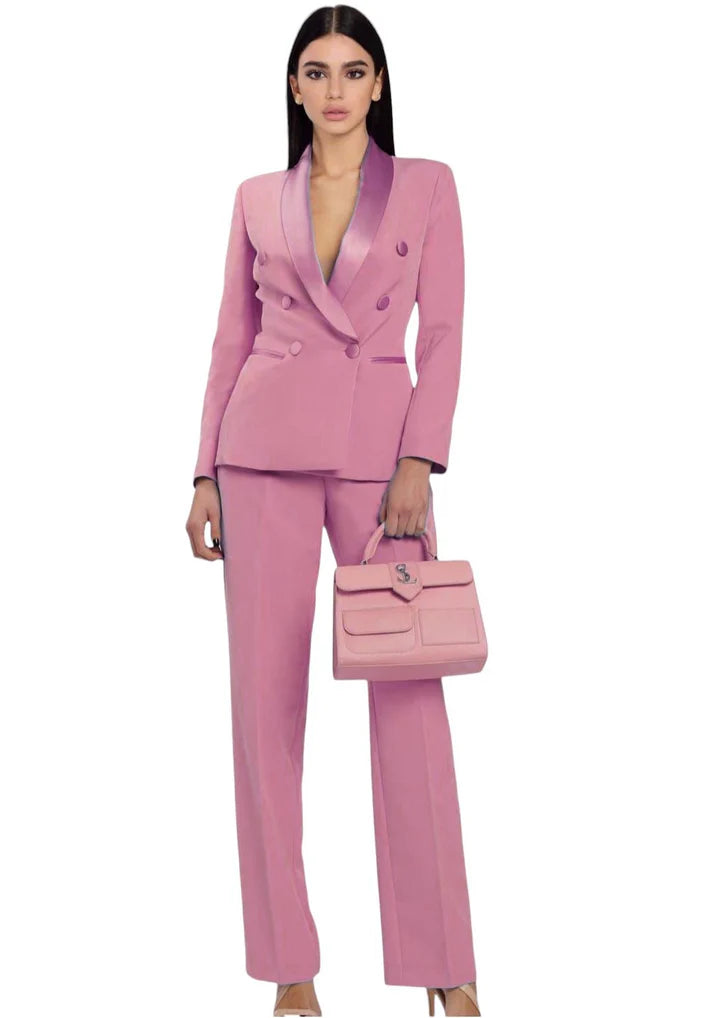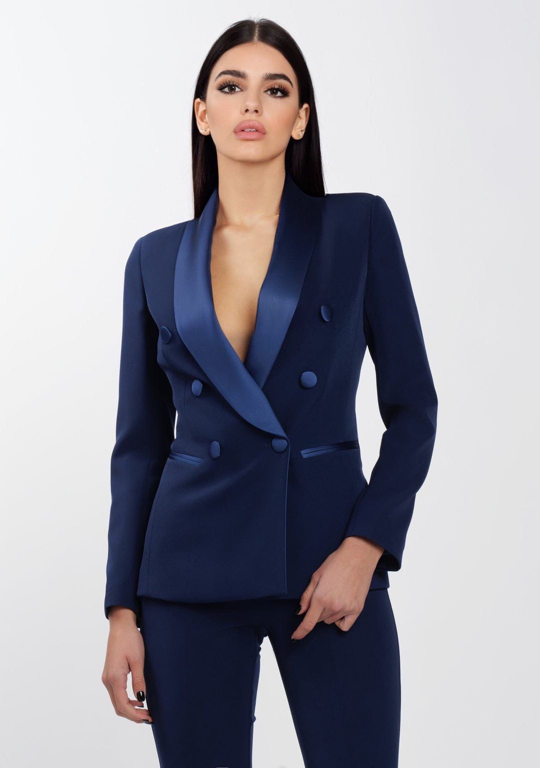 Questo tailleur italiano, realizzato con cura e con materiali di alta qualità, presenta inserti in raso che donano un tocco di eleganza e raffinatezza. Disponibile in taglie dal 38 al 56, questo tailleur è perfetto per un look sofisticato e di classe, perfetto per qualsiasi occasione.